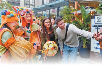 在上海新天地,外国游客与民俗巡游表演的演员合影留念。杨建正摄(影像中国)