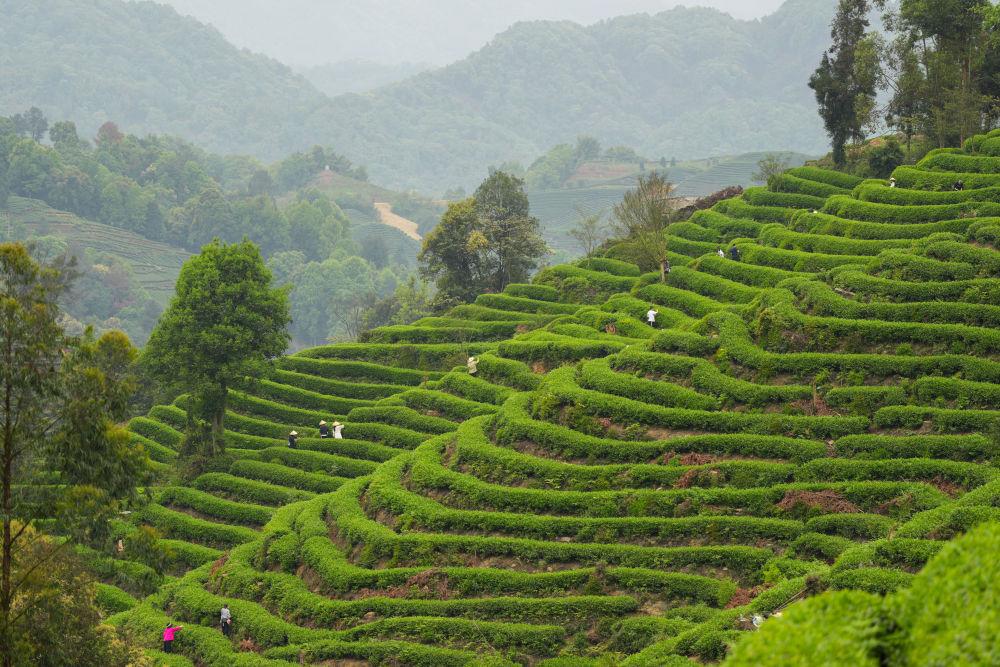 4月5日,人们在四川省雅安市牛碾坪万亩观光茶园体验采茶。新华社记者 胥冰洁 摄