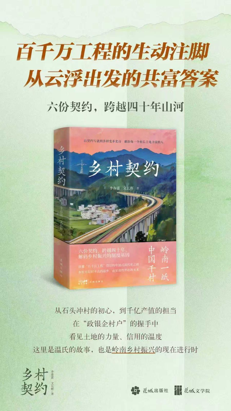 该书由著名作家李春雷,与云浮本土作家文长辉历时三年五个月潜心观察创作,是广东省重点文艺精品项目,由花城出版社出版。作品以总部在广东云浮的农业龙头企业温氏集团6次发展蝶变历程为主线,聚焦扎根中国乡村的六份契约:“七户八股”产权契约、“公司+农户”生产力契约、全员股东共享契约、科技兴农发展契约、区域扶贫协作契约、政银企村户一体共富契约,生动诠释乡村契约精神,展现粤北乡村振兴与共同富裕的生动实践。