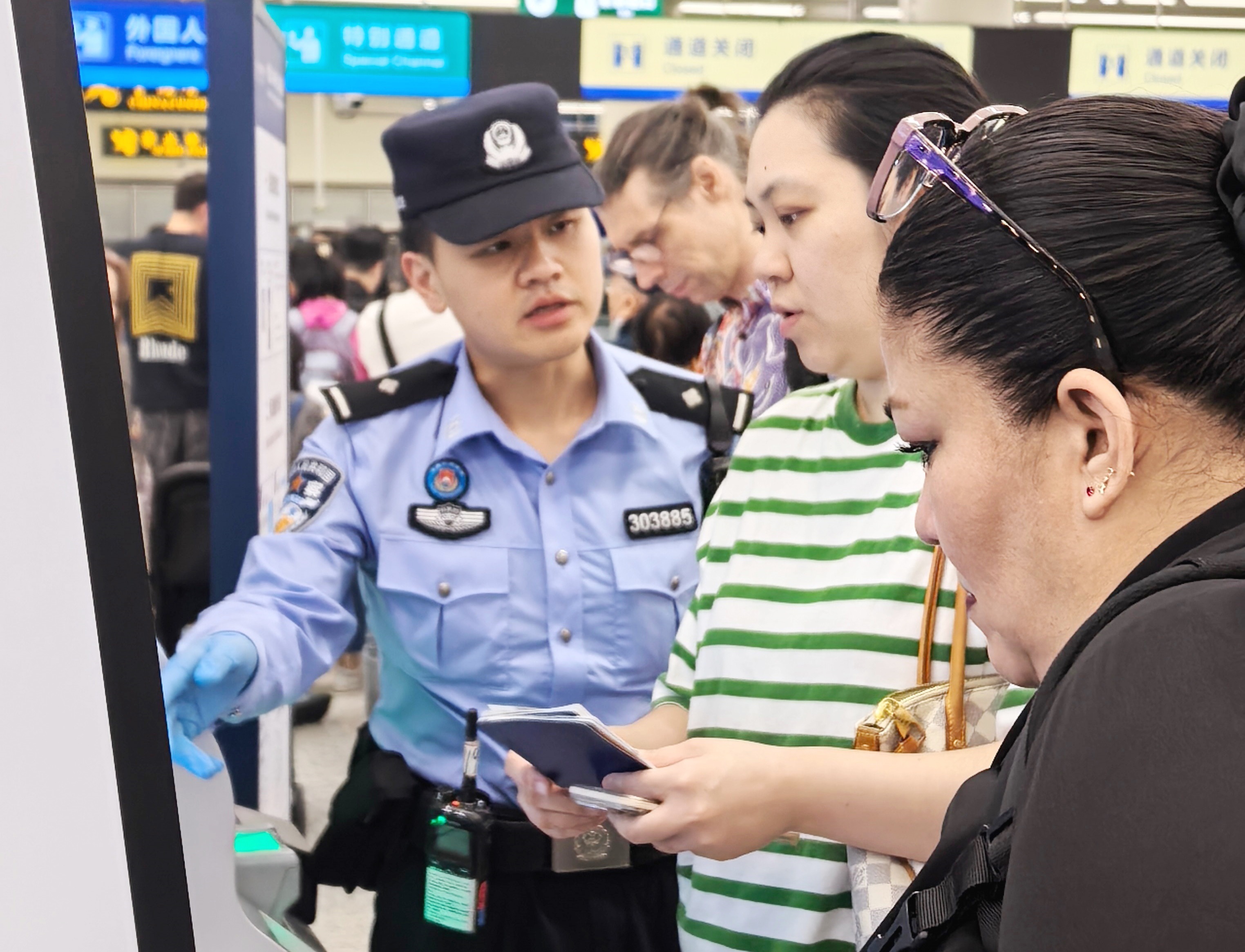 皇岗边检站民警在福田口岸入境大厅引导赴广州参加广交会的外国客商进行网上填报入境卡。