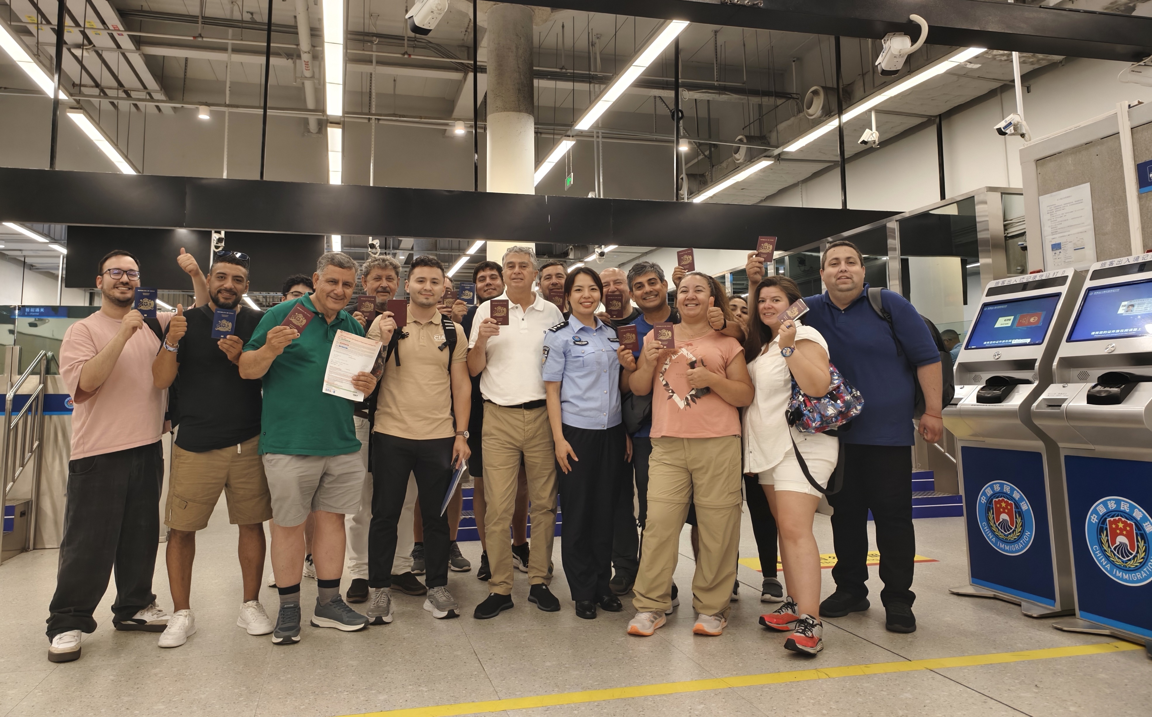 前来参加广交会的南美客商团办完入境查验手续后点赞皇岗边检站移民管理警察专业高效服务。